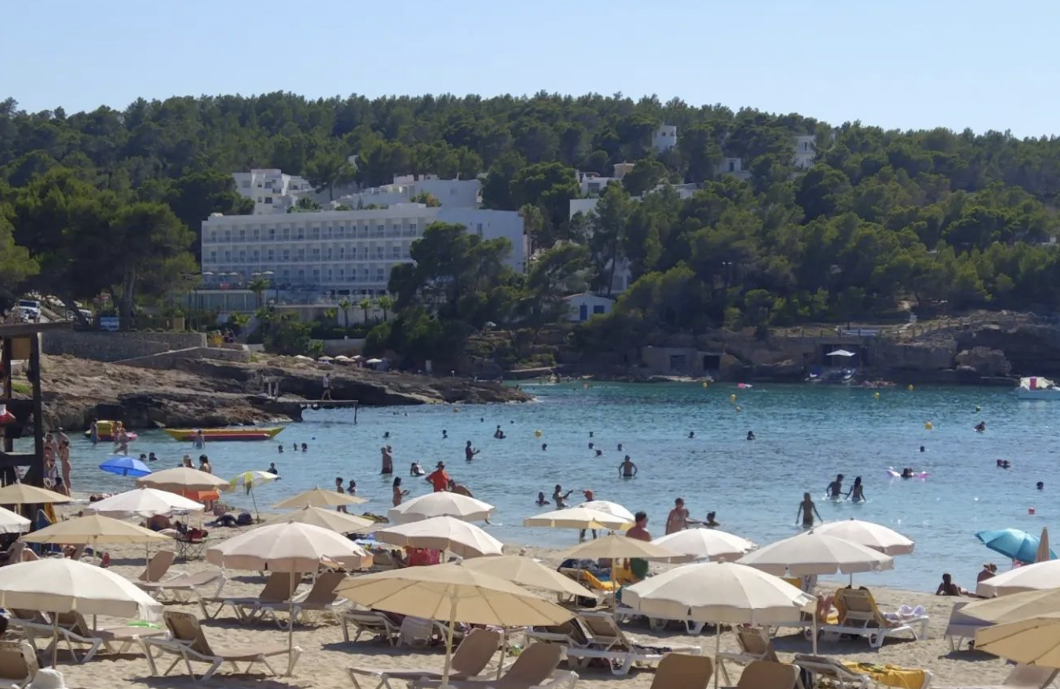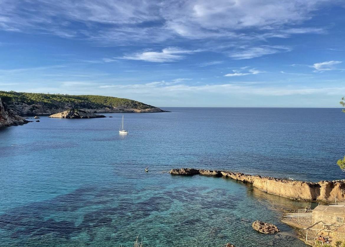 Many say Cala Xarraca is one of Ibiza's "prettiest" beaches, but opinions vary. While some adore it, others aren't as impressed. We'll give you our honest take on this famous beach, pointing out both its pros and cons. That way, you can decide if you want to visit during your Ibiza trip or check out other beautiful beaches instead. Situated in the quiet northern part of Ibiza, Cala Xarraca is a charming cove with clear waters, perfect for snorkeling and diving. Though not large, its beauty lies in its surroundings – think pine trees, white villas, and stunning red rocks. This picturesque scene also attracts photographers looking to capture its charm.
